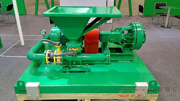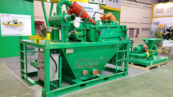 本次展會主要展出了120m³/h處理量的泥漿回收系統及配套的射流混漿系統,主要配置了一臺GNZY753E-Y1S型篩泥一體機,雙層篩網設計,面積達到2.225m³,可分離固相粒度40微米,旋流器采用高質量聚氨酯材質,耐磨,使用壽命長,振動電機采用國際意大利OLI品牌或者美國馬丁品牌,篩箱底框采用不銹鋼材質,振動強度達到7.1G(可調),并配有GNSB6×5A(37KW)離心泵為除泥供漿泵,采用機械密封,使用壽命長并便于維修。整套系統撬裝設計,移動便捷,使用方便。